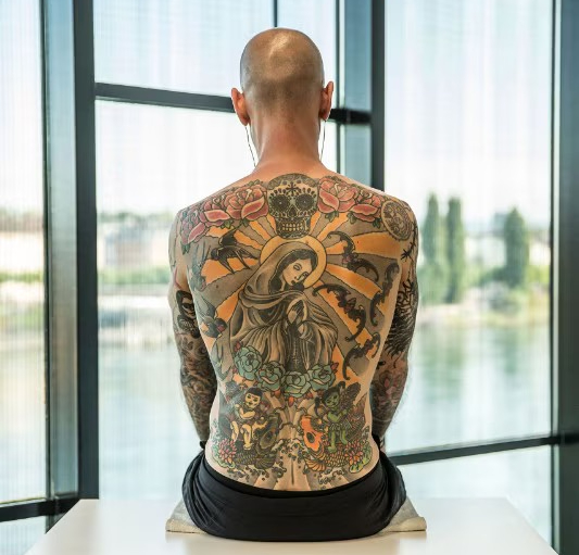 Chi, più di ogni altro, crea immagini componendo pazientemente innumerevoli punti in masse organiche più o meno contratte? I tatuatori. Se non siamo soliti annoverarli tra le fila degli artisti, la ragione è probabilmente da ricercarsi più nella natura delle loro opere che nei loro aspetti tecnico-formali, o nei tratti di originalità. Un tatuaggio infatti diviene tutto’uno con il corpo del committente, vive le sue stesse vicissitudini quotidiane e si subordina al suo ciclo vitale. Paradossalmente, sono proprio queste le ragioni che hanno spinto l’artista contemporaneo Wim Delvoye a dipingere una “tela umana”, tatuando elementi ispirati alla cultura centro-americana sulla schiena di Tim Steiner. Al di là delle sue caratteristiche estetiche, l’opera intendeva mettere in discussione alcuni concetti fondativi della definizione di arte, ad esempio attraverso una supposta inalienabilità… o no? Il cortocircuito si è creato appena dopo l’esecuzione dell’opera, quando Tim Steiner ha venduto cara la propria pelle (è proprio il caso di dirlo!) al collezionista tedesco Rik Reinking, il quale la “espone” in mostre itineranti e conserva il diritto di prelevarla e incorniciarla dopo il decesso di Tim. Un’operazione di indiscusso gusto macabro a conferma – qualora ce ne fosse ancora bisogno – che l’arte contemporanea si alimenta del costante superamento dei limiti.