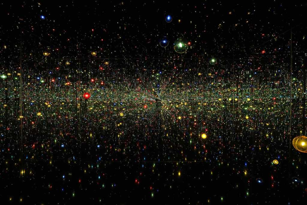 Ossessiva è indubbiamente anche la reiterazione di punti che contraddistingue le opere dell’artista di origine giapponese Yayoi Kusama. Vittima di allucinazioni visive e uditive sin dall’infanzia, l’artista ha trasformato la propria fragilità nel punto (appunto!) fondante della propria poetica, chiamandoci a partecipare al suo mondo interiore. Più che un mondo, in realtà, un universo in espansione, che si diffonde nello spazio e sugli oggetti, fino a prendere le sembianze della performance, della scultura, della letteratura, del video-making e dell’installazione immersiva, proprio come accade nel suo Infinity Mirrored Room – A Wish for Human Happiness Calling from Beyond the Universe: una stanza composta di superfici specchianti e abitata da bulbi luminosi che si moltiplicano all’infinito, invitando il visitatore a scomparire in un terapeutico processo di auto-annullamento.