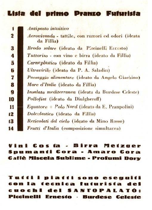 Il primo menù futurista, redatto in occasione di un pranzo tenutosi a Torino nel 1931, lo stesso anno della pubblicazione del Manifesto di cucina futurista, tacciava la pastasciutta di fiacchezza e pessimismo e aboliva l’uso delle posate! Nella loro costante rincorsa verso una fusione totale di arte e vita, gli esponenti della prima Avanguardia intrisero le loro effimere opere commestibili di irriverenza performativa e le etichettarono con reazionari neologismi: fecero così la loro comparsa sulla tavola una “aerovivanda tattile con rumori e odori” (da consumarsi accarezzando con la mano sinistra una tavola tattile, mentre nell’aria echeggia una melodia classica e i camerieri spruzzano note di profumo sulle nuche dei commensali), e un “ultravirile” (lingue di vitello e gamberi intervallati da un’aragosta scrostata ricoperta di zabaione verde con in testa una corona di creste di gallo). Dei gusti, si sa, non si discute…