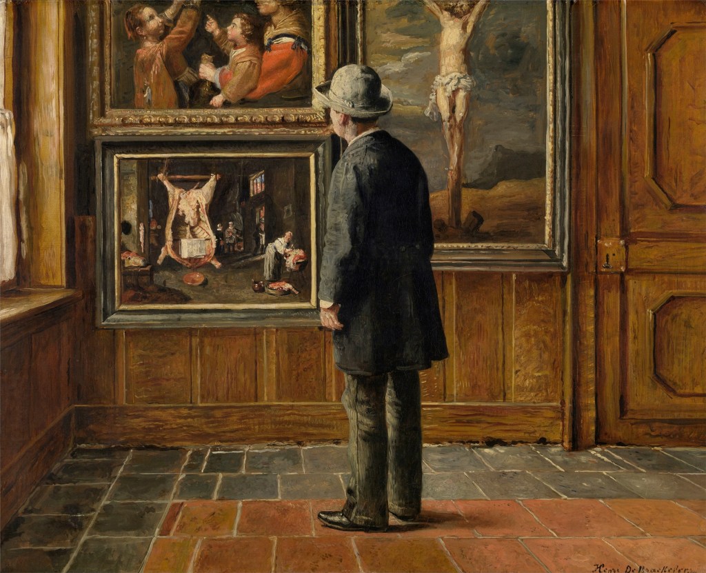 A noi ignoto, nelle fattezze e nel profilo anagrafico, è invece l’amante dell’arte ritratto dal pittore belga Henri de Braekeleer con uno stile che potremmo definire “impressionismo fiammingo”, reso a morbide pennellate in una gamma di colori vivacemente rischiarata dall’immancabile finestra che corre lungo la parete-quinta (ogni riferimento a J. Vermeer è puramente voluto).