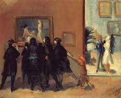 Non una semplice visitatrice, ma una doppiamente eccezionale: un’americana a Parigi e una pittrice tra gli Impressionisti. A testimonianza di tanta eccezionalità non concorre soltanto il titolo dell’opera di Degas, ma l’atteggiamento superbo e spavaldo con cui l’autore ha voluto ritrarre l’allieva Mary Cassat in visita al museo con la timida cugina, mentre ancheggia sul suo ombrello più ritorta di una cariatide gotica.